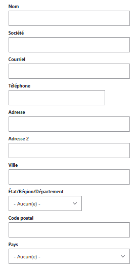 | Adresse simple | Adresse structurée (ligne d'adresse, ville, code postal...). | Au sein du paramétrage, il est possible de définir une liste pays, de mettre en place l'Autocomplétion et de définir des champs requis (ex. code postal). | |