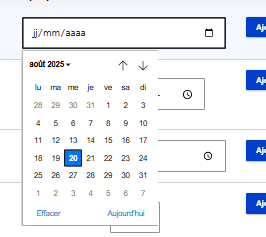 La date est part défaut au format (jj/mm/aaaa), il est possible au sein du paramétrage Min/Max. Il est par exemple possible de borner à la selection d'une date sur les 4 prochains jours ouvrés en selection seulement les jour de la semaine et en saisissant "+4 days" dans la Date maxium : |