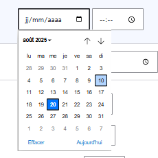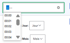 | Heure | Sélection de l'heure uniquement. | Le format de l'heure est persanlisable ainsi que le "pas" entre chacune des heures affichées dans la liste | |