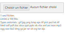 | Fichier | Téléversement générique (formats variés). | Paramétrage possible de la Taille max — Types autorisés — Nombre de fichiers. | |