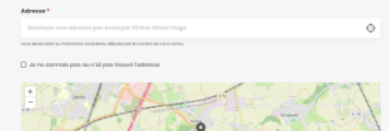 | Localisation | Champ d'adresse avec autocomplétion et validation (ex. 33 Rue Victor Hugo). Présence d'une carte | Ce champs peut être lié à l'API BAN : https://api.gouv.fr/les-api/base-adresse-nationale ou au fichier d'adresse de votre choix |