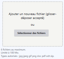 | Pièce jointe (porte doc) | Uploader multiple (ex. 6 fichiers). | Parmétrage possible du Nombre max de fichier; des Extensions et du Drag & drop. |